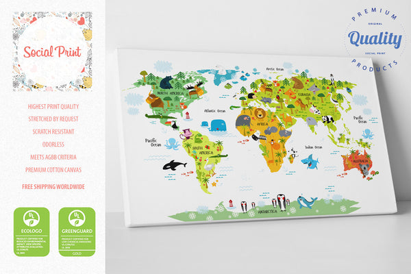 Animals Map of the World Canvas print White for Kids Room World map with animals for nursery is perfect wall hanging to educate your child. Learn colors, animals of the...