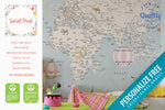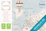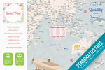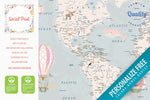 Highly Detailed World Map Wallpaper for Girls Room with Hot Air Balloons, Planes, Animals, Countries & Cities, Nursery Wallpaper / Non-Woven wall coverings