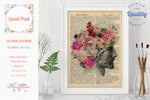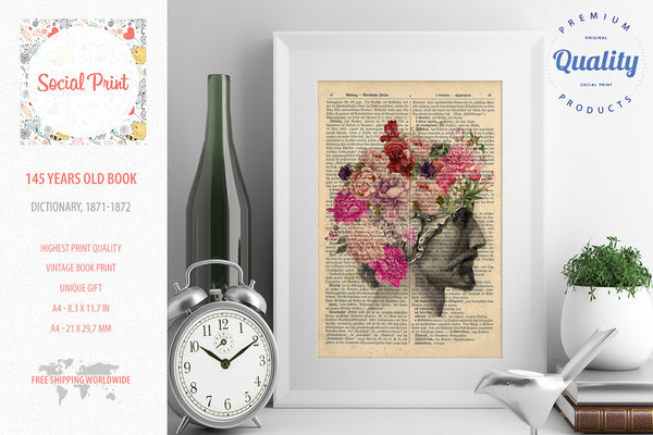 Flower Mind Design Vintage Anatomy printed on 147 years old German Encyclopedia page (1872).Human antique head illustration with watercolor flowers. This antique anatomical illustration represents a perfect union of ART,...